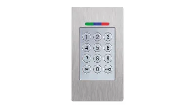 Features: Access control by means of a 4-6 digit code. Available with two relays (e.g. gate opening) or a control panel output. Any attempted unauthorized access activates the locking mechanism. Dimensions: 45×75 mm.