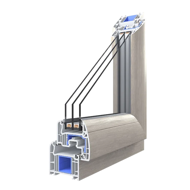 Class A 6-chamber profiles with an installation depth of 70 mm (frame) and 74 mm (sash).